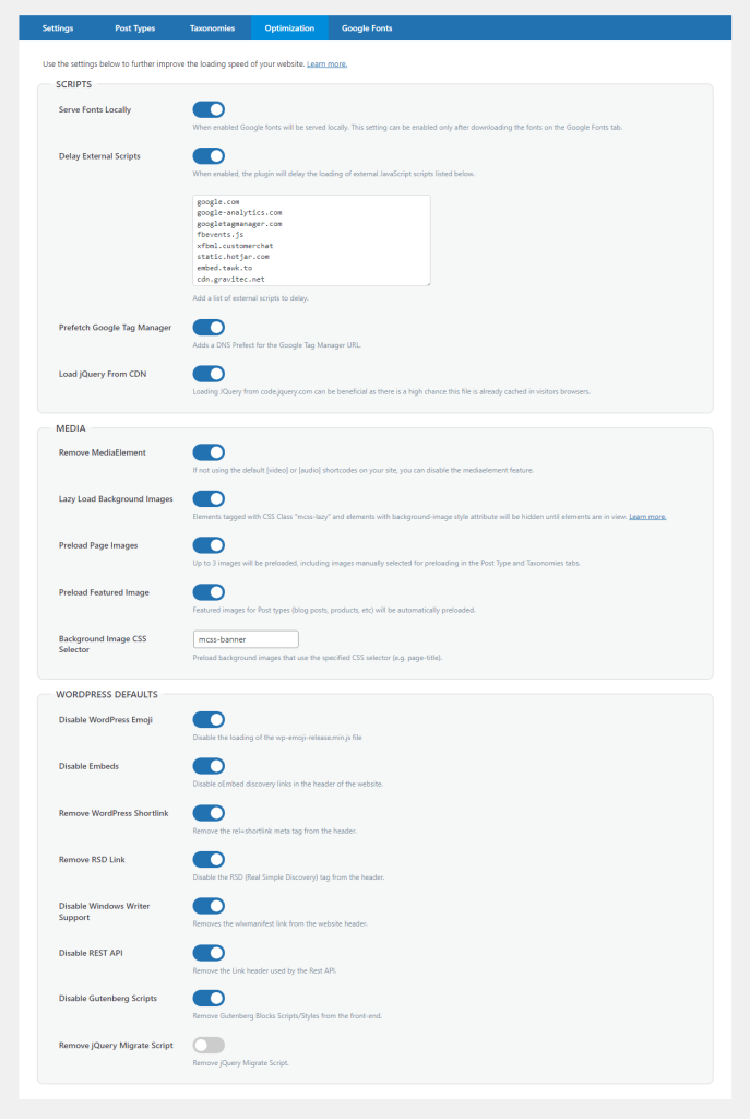 Disable default settings loaded automatically by WordPress including emojis, embeds, block editor and more.
